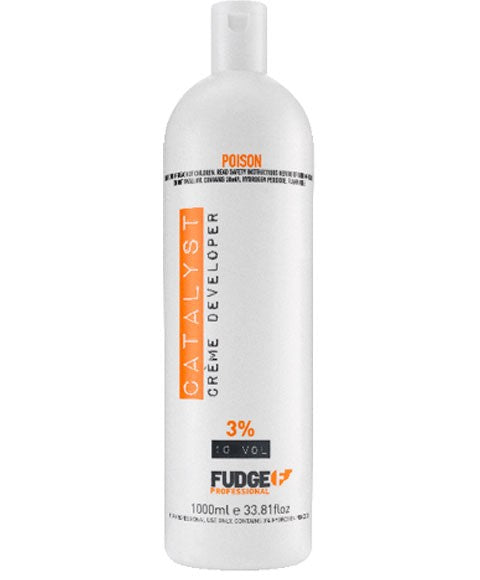 Fudge Catalyst Creme Developer peroxide. Strengths Available: No Lift (1.5 percent), 10 vol (3 percent), 20 vol (6 percent), 30 vol (9 percent), 40 vol (12 percent). No Lift Developer Converts Headpaint to Demi Permanent Colour. Enriched with waxes to protect the hair during the hair colouring process. Moisturizing Humectants which provide longer lasting strength and regulates the correct amount of oxygen needed to deposit pigments or lift natural hair colour.