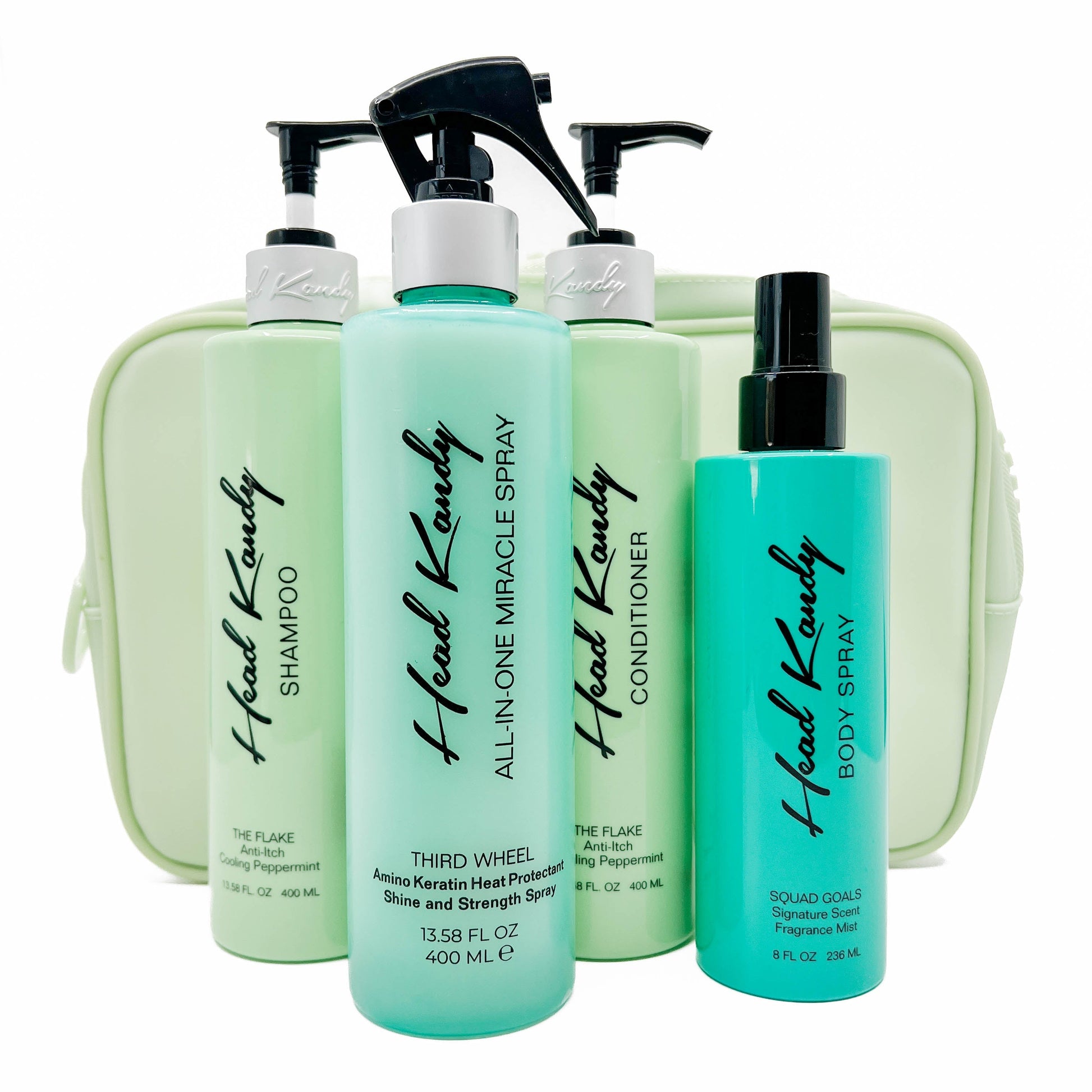 Includes The Flake Shampoo and Conditioner, Squad Goals Third Wheel Miracle Spray, Limited Edition Matte Green Jelly Bag and a FREE Squad Goals Body Spray.