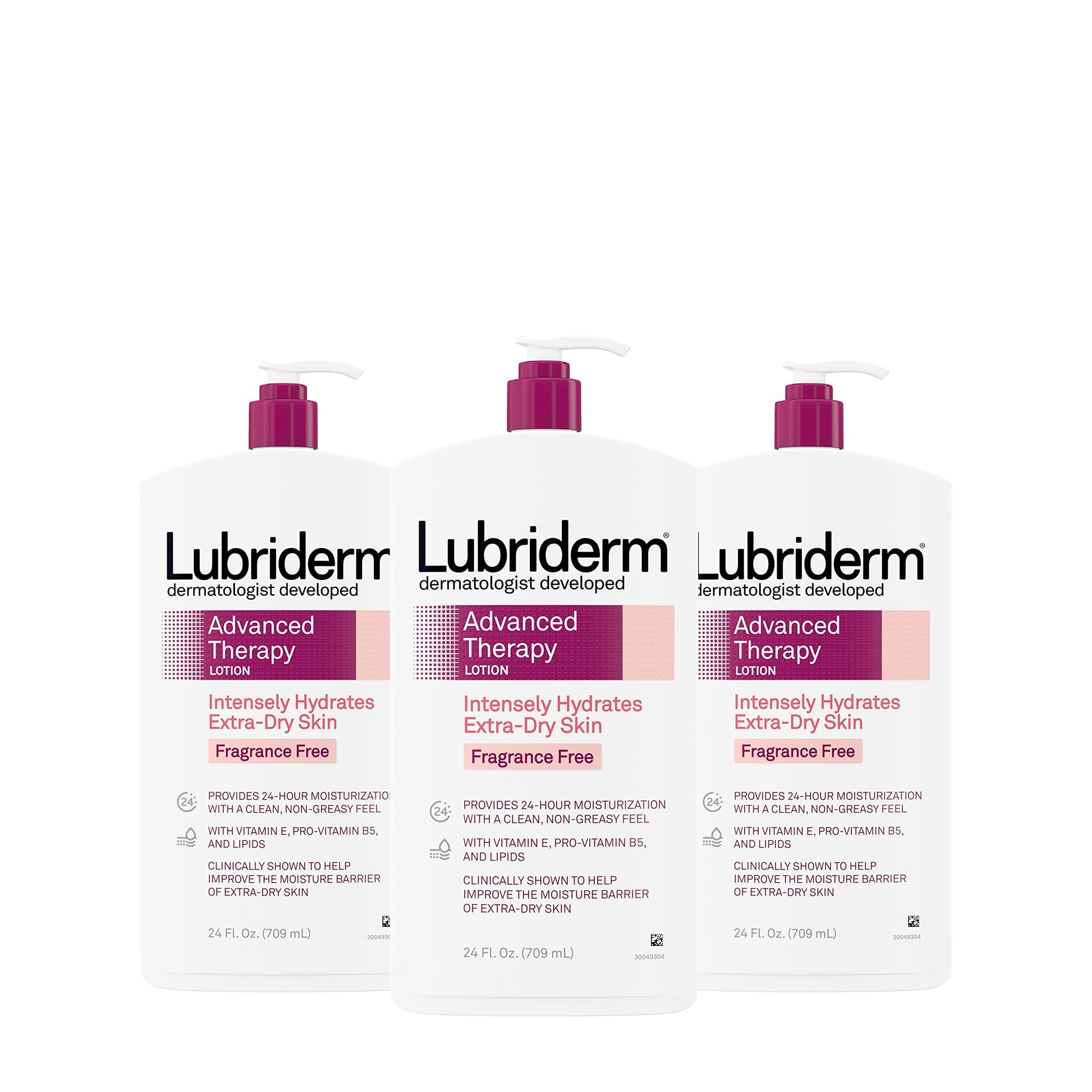 - Value pack of three 24-fluid ounce bottles of Lubriderm Advanced Therapy Fragrance-Free Daily Moisturizing Lotion with Vitamin E and Pro-Vitamin B5 for extra-dry skin