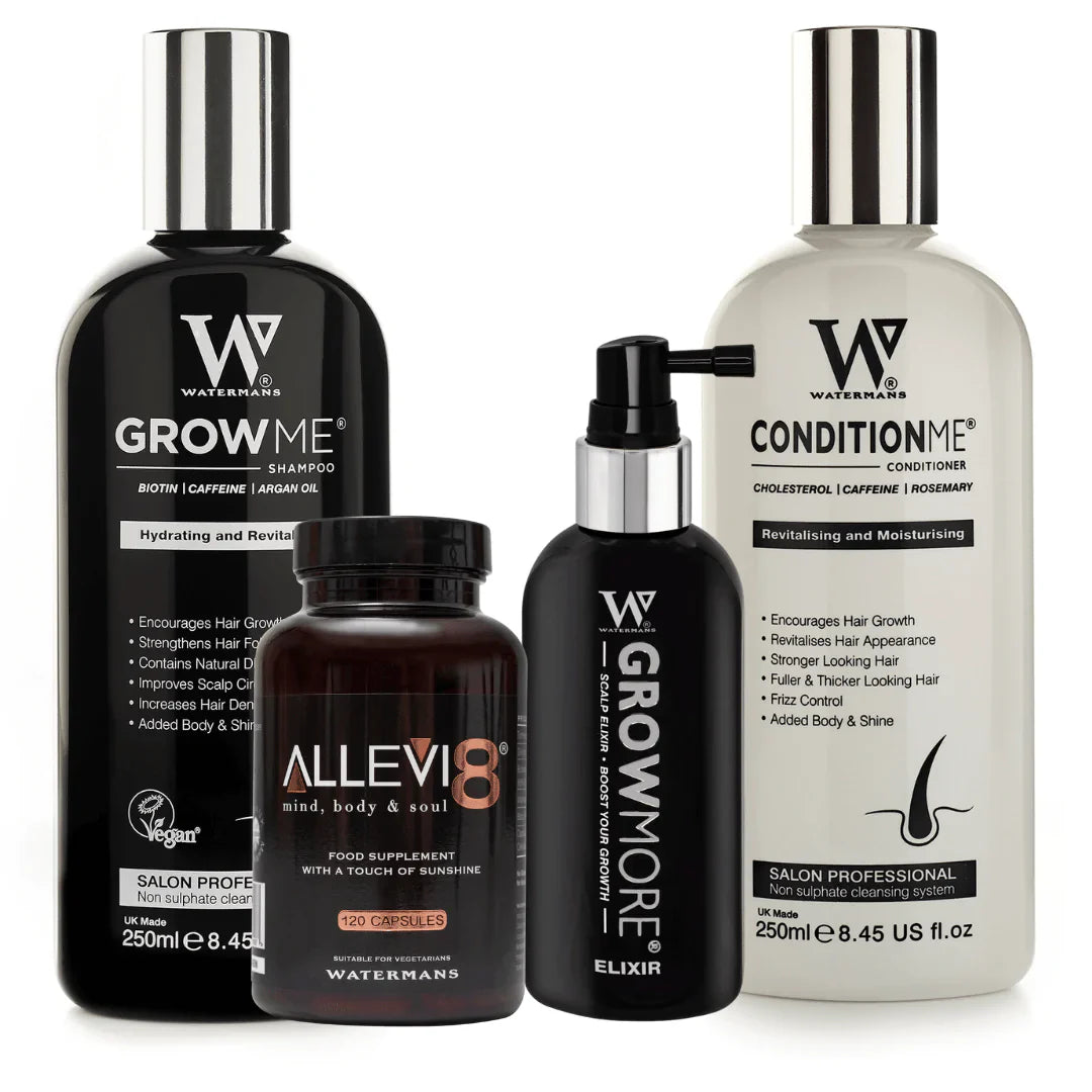 The menopause kit targets 1st targets your scalp with Biotin, Rosemary, Caffeine, Niacinamide, Argan Oil, Allantoin, Lupin protein, Shea Butter and a range of natural oils and vitamins making your scalp the optimum environment for healthy growth. Second stage with Allevi8 powerful combination of ancient herbs.